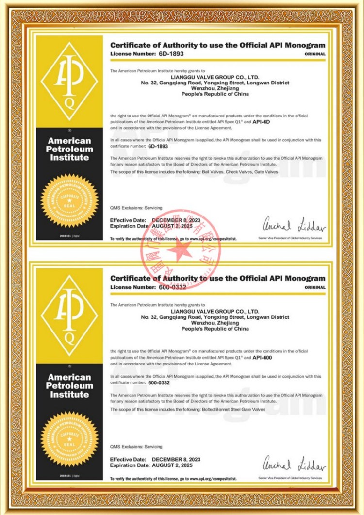 บริษัทของเรามีใบอนุญาตการผลิตวาล์วท่อส่งแรงดันต่างๆ และผลิตภัณฑ์ของเราได้ผ่าน TS A1, ISO 9001, ISO 14001, ISO 45001, API 6D, API 600, APL 609, CE/PED, API 607, API 6FA, ISO 15848-1 และระบบ EAC และการรับรองผลิตภัณฑ์ นอกจากนี้เรายังมีใบรับรองสิทธิบัตรการประดิษฐ์สำหรับวาล์วต่างๆ เช่น บอลวาล์ว, บัตเตอร์ฟลายวาล์ว, เซฟตี้วาล์ว และสต็อปวาล์ว